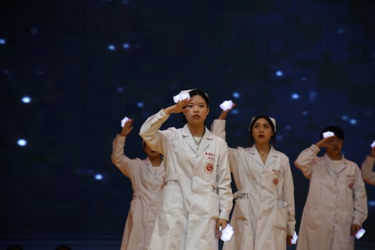 晚会上,公司的员工进行了文艺表演,手语操《夜空中最亮的星》、诗歌朗诵《医护·耀初衷》、舞蹈《美人关》,护士礼仪展示等精彩节目引人入胜、发人深省,赢得了阵阵掌声。