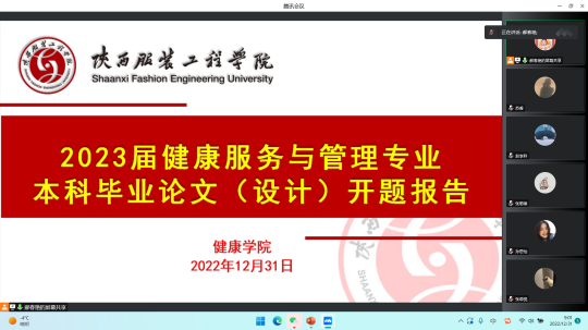 为了全面、持续、深入地落实本科教学工作合格评估整改工作的要求,深化公司产品改革,加强教学管理,把2023届毕业论文开题工作做细、做实,切实做好毕业生毕业论文指导工作。12月31日9:00-12:00,公司对2023届健康服务与管理专业毕业生进行了本科毕业设计(论文)开题答辩。本次答辩会全体毕业生及评审专家参加,公司通过腾讯会议进行开题答辩工作,会议由健康管理系主任郝春艳主持。