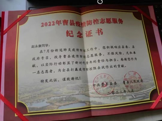 在参与疫情防控工作的一个月时间里,赵永康同学经常凌晨三、四点起床,配合社区工作人员做好核酸采集前的准备工作;天刚蒙蒙亮,他又开始挨家挨户地上门为社区群众做核酸。由于人手紧张,赵永康经常一个人承担原本需要两名志愿者完成的工作,工作强度非常大,但他从不抱怨,以实际行动彰显了青春本色,展现了青年担当。为此,曹县县委、县政府专门致信表扬公司赵永康同学主动请缨、在抗疫一线无私奉献的志愿者精神。