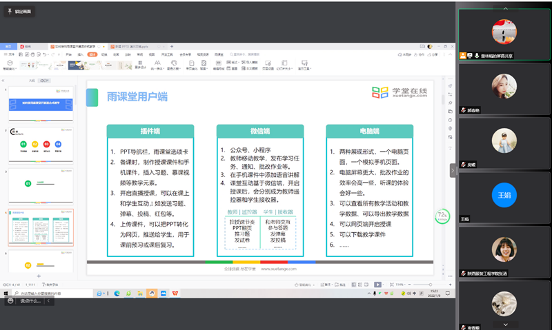会议上,董林娟老师传达了公司线上教学工作的具体要求,并针对如何使用雨课堂开展混合式教学、雨课堂使用手册、雨课堂+腾讯会议操作攻略等,对各位老师进行了培训。