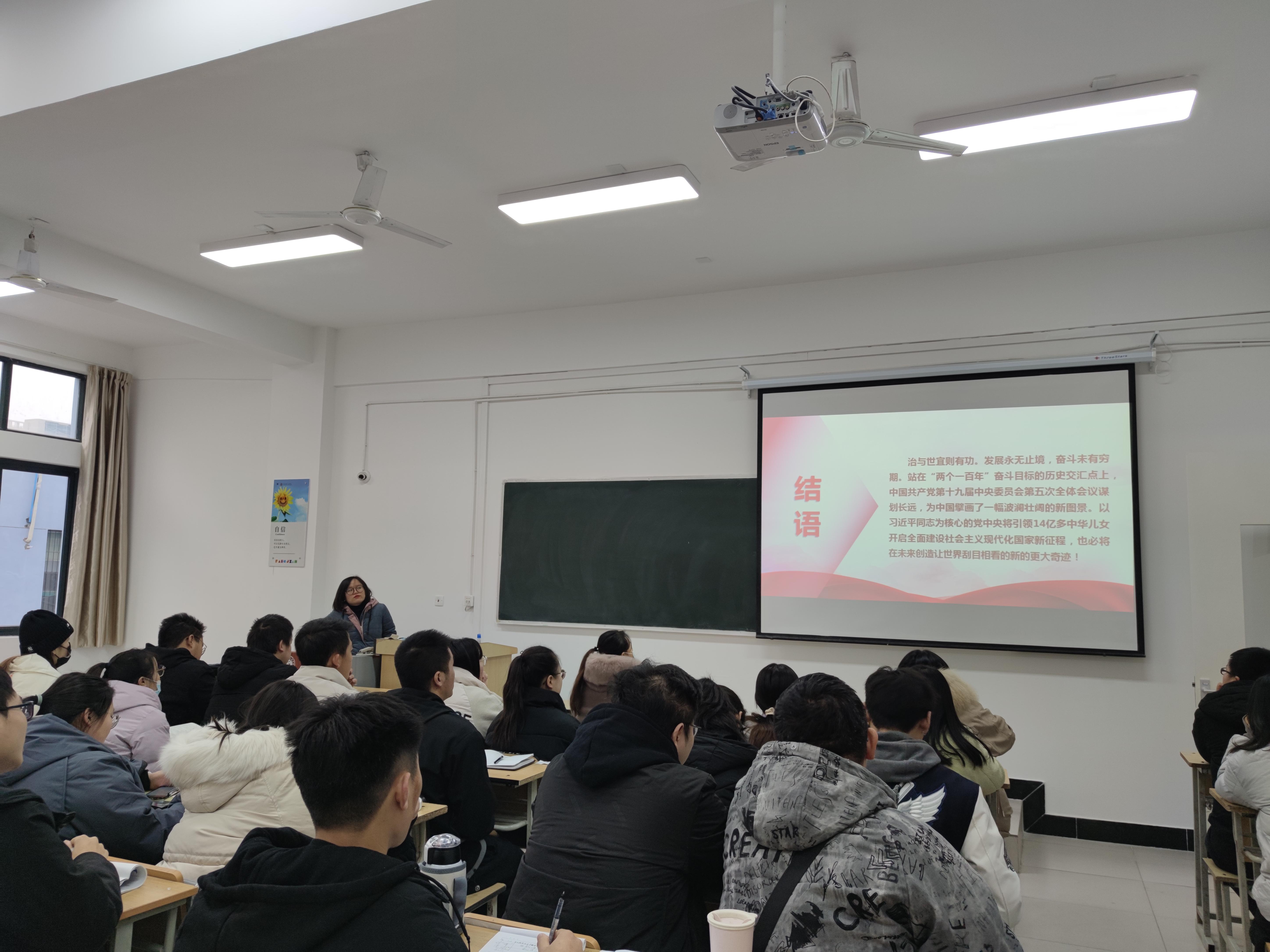 为深入学习贯彻党的十九届五中全会精神,落实好《中共陕西省委教育工委陕西省教育厅关于全省教育系统学习宣传贯彻党的十九届五中全会精神的通知》精神,在公司掀起学习宣传贯彻党的十九届五中全会精神热潮,2020年12月17日下午4点在B306教室,公司党委宣讲团、马克思主义公司王欢老师为公司师生党员、预备党员、积极分子解读了党的十九届五中全会精神。此次报告由公司党委副书记耿鹏飞老师主持。