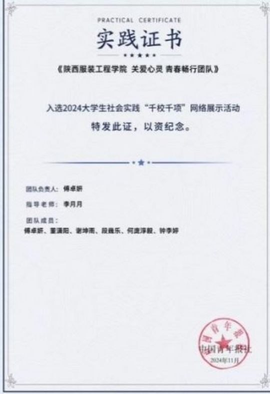 活动前期,公司广泛动员,积极招募,严格立项及评审流程,最终成功组建了 5 支富有活力与使命感的社会实践团队。在实践过程中,公司师生齐心协力,深入基层,以实际行动践行社会责任与担当,取得了一系列令人瞩目的成绩。其中,公司辅导员张涵凭借在活动中的卓越表现,荣获 “省级先进个人” 荣誉称号,其敬业精神与专业素养得到了省级层面的高度认可。同时,由辅导员李月月老师悉心指导的 “关爱心灵 青春畅行” 团队,凭借创新的实践模式与显著的社会影响力,在众多项目中脱颖而出,成功获评中国青年报 “千校千项” 网络展示活动 “全国优秀项目”,为公司社会实践树立了优秀典范。