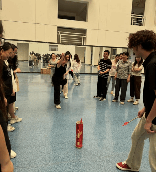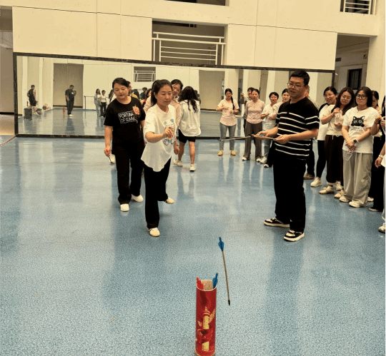 随后开展的 “投壶比赛”,巧妙融合传统与趣味。老师们手持箭矢,神情专注,依次向壶中投出。每当有老师百发百中,现场便响起热烈的欢呼与掌声。这项活动不仅考验手眼协调能力,更让老师们在体验传统游戏魅力的同时,抛开工作烦恼,沉浸于团队协作的乐趣。