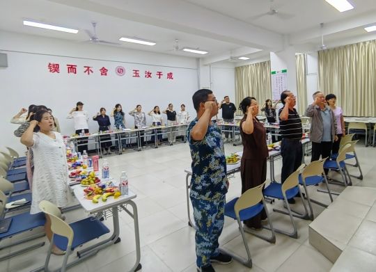 随后,会议进入庄严的教师宣誓环节。在霍科科经理的带领下,全体教师右手举拳,郑重宣誓。铿锵誓言在教室内回荡,传递出大家对教育事业的坚定信念与崇高使命感。