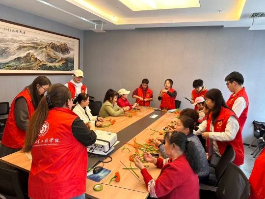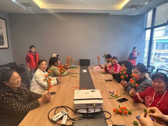 老人们学得认真投入,有的仔细摆弄手中的材料,有的开心地和志愿者讨论色彩搭配。现场气氛热烈,欢声笑语不断。柔软的扭扭棒在老少协作的巧手中,逐渐变为寓意“事事如意”的柿子、清新淡雅的雏菊、秀丽别致的蓝星花……每一件作品都凝聚着志愿者的用心与老人的喜悦。活动结束后,许多老人自豪地展示着自己的作品,并热情邀请志愿者合影留念,脸上洋溢着灿烂的笑容。