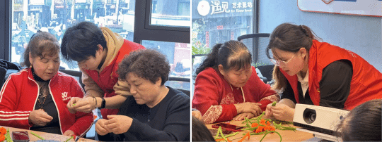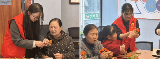 面对不太熟悉操作的老人,志愿者们耐心蹲下身,放慢动作,一步步示范讲解:从对折固定花芯,到缠绕花瓣、调整弧度。“奶奶,您选的这个颜色真好看,我们做一朵特别的花送给您!”他们一边鼓励,一边协助固定细节,并穿插分享手工小技巧与花朵背后的温馨寓意。