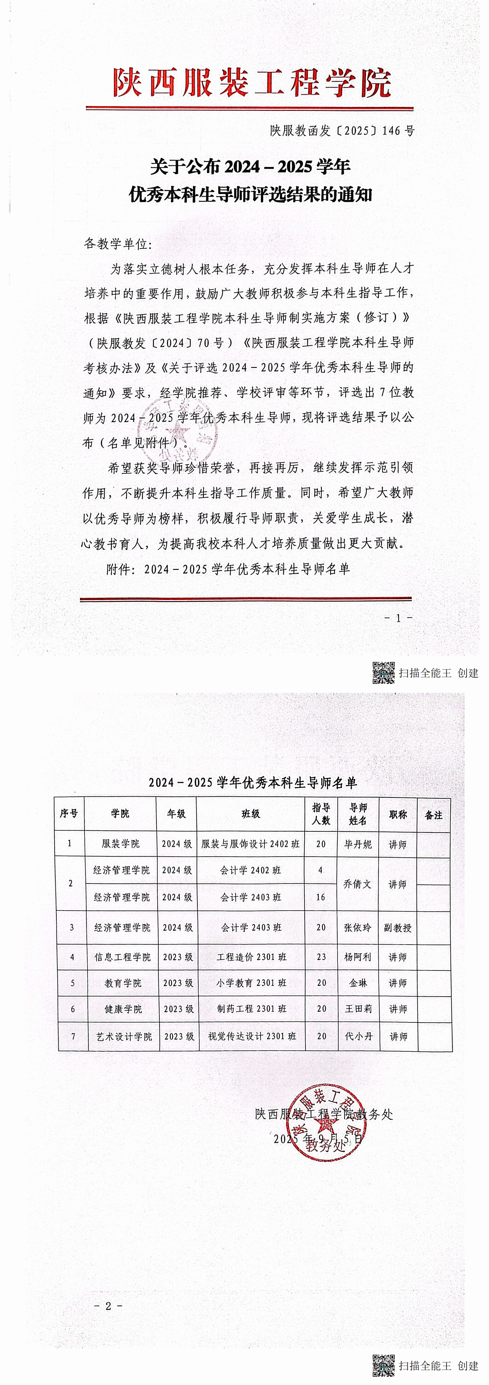 关于公布2024-2025学年优秀本科生导师评选结果的通知