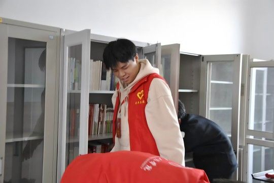 话音刚落,志愿者们挽起衣袖投入行动。在村文化筹划中心,他们用扫帚划过青砖地面,抹布擦亮知识之窗,书籍在指尖翻飞归位,汗水与欢笑交织成春日里最动人的劳动交响曲。这些书架就像等待知识种子的土地,志愿者们愿做播种者。他们轻拭书脊的动作温柔而虔诚。当蒙尘的书籍在木架上整齐列队,当阳光透过窗棂为文化空间镀上金边,属于仓门村的"知识银行"正悄然焕新。