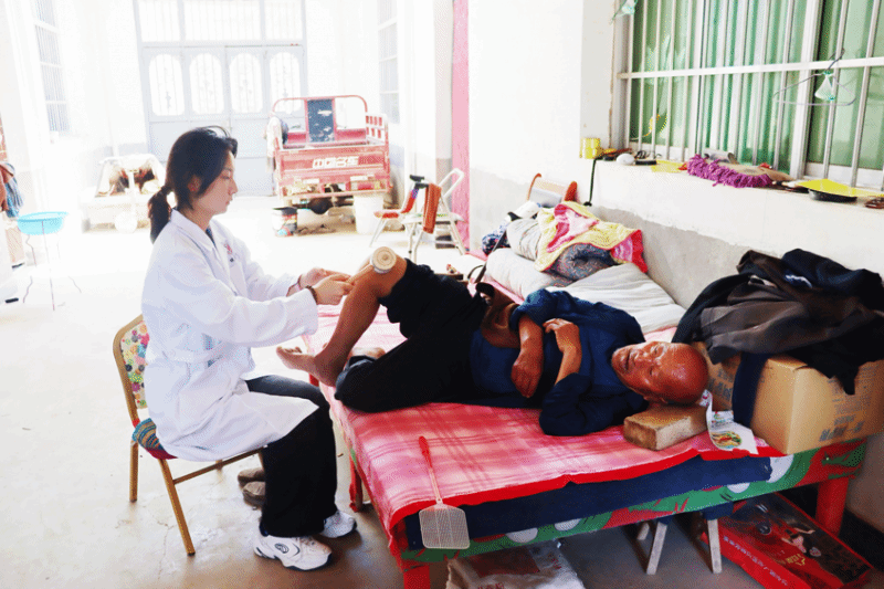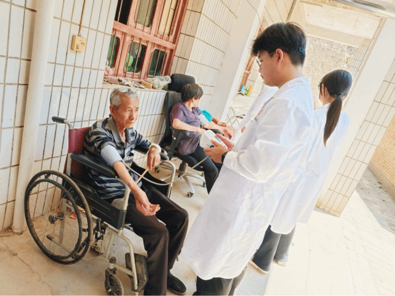 对于行动不便的留守老人,“健农益行”团的服务从未止步于村委大院。队员们顶着烈日,携带便携式设备,穿梭于乡间小道,将健康服务精准入户:在王爷爷家中,队员们不仅为他测量了血压、血糖,还仔细检查了他常吃的几种药物,发现存在过期和存放不当的问题,现场指导清理并写下清晰的用药提醒贴在墙上。