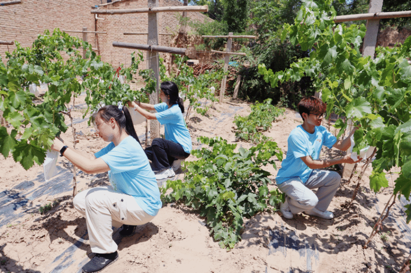 当了解到村中不少留守老人正为葡萄园套袋、除草等繁重农活而发愁时,“健农益行”团迅速调整计划,将服务延伸到田间地头。在村民的指导下,队员们认真学习葡萄套袋技巧与除草要领,随即挽起裤腿,躬身投入劳作。