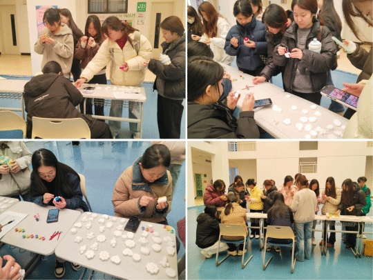 同学们早早来到活动现场,或围站画布前参与集体涂鸦,不时交流创作思路、互相配合填补空白,现场满是欢声笑语,最终将画布绘成凝聚集体心意的温暖作品,真切感受团队协作的归属感与幸福感;或在涂娃娃区域拿起画笔为纯白陶瓷娃娃上色,有的绘可爱卡通形象,有的设计国风纹样,在色彩勾勒间释放心情,尽情感受艺术创作带来的疗愈乐趣。