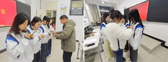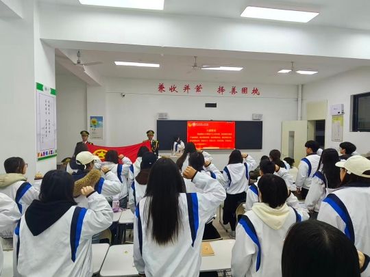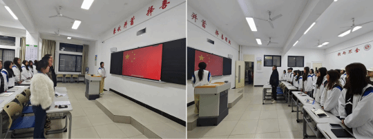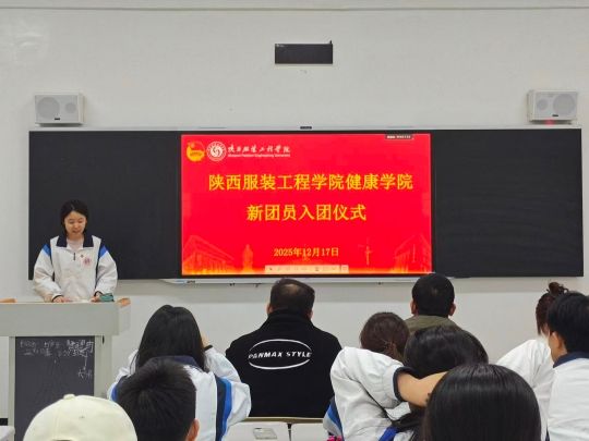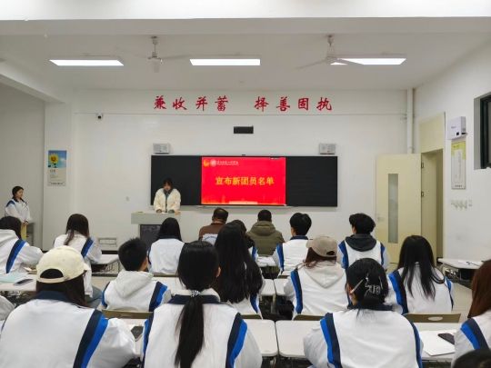 在全场师生的见证下,耿鹏飞、张涵、薛垚三位老师为新团员逐一佩戴团徽。金色的团徽闪耀在胸前,不仅是共青团员身份的象征,更承载着组织的信任与期望。紧接着,在李雨瑶的带领下,全体新团员面向鲜红的团旗,高举右拳,庄严宣誓:“我志愿加入中国共产主义青年团……” 铿锵有力的誓言回荡在会场,字字千钧,凝聚着新团员们坚定的政治信仰和为共产主义事业奋斗终生的决心。
