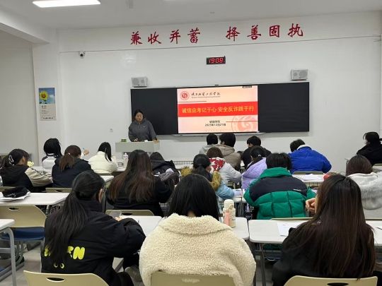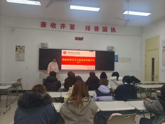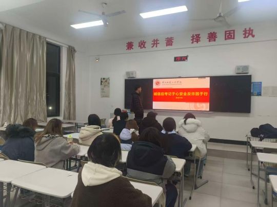 班会过程中,师生互动环节气氛热烈。员工们结合自身见闻分享反诈经历,就备考中遇到的问题向老师请教,辅导员则针对期末复习规划给出建议,强调合理安排时间、劳逸结合的重要性,同时提醒员工在备考之余关注自身安全,远离校园不良网贷,保护好个人财物与信息安全。教室墙上“兼收并蓄,择善固执”的校训标语,也成为本次班会的精神注脚——择“诚信”“安全”之善,方能行稳致远。