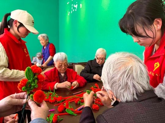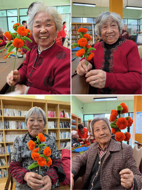 一句句亲切问候,一次次暖心搀扶,一个个温柔瞬间,让养老院内暖意融融。志愿者们还与老人们一同开展扭扭棒创意手工花制作活动,指尖缠绕色彩,心意凝成花朵,大家耐心协助老人们弯折、造型、装饰,一朵朵别致可爱的手工花在手中悄然绽放。志愿者们以真诚的笑容、细致的服务,让老人们感受到家一般的温馨,脸上洋溢起幸福满足的笑容。
