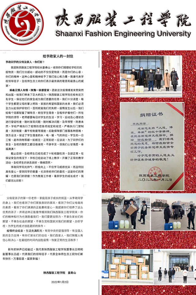 姜寿山董事长带领一群工作人员满怀感激之情接受了这份来自陕服学子的厚礼,接受了河南人民对陕西人民抗疫的援助。刘继兵助理组织人力把物资第一时间分发到员工手里,姜董事长亲自为李政同学颁发了荣誉证书,还亲笔为李政同学父母写了一份感谢信:“收到你们捐赠给公司的抗疫物资,我们万分感动。感动的不仅仅是物资,而是你们的心意、你们的精神。这种心意和精神给予了我们信息和力量。我谨代表公司领导班子、全校师生员工向你们表示崇高的敬意和衷心的感谢。”董事长在信里还向李政父母介绍了公司抗疫防控工作的举措以及显著成效,请他们放心,请所有陕服员工家长放心,我们坚守校园,护佑每一位员工平安。