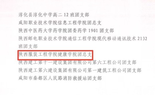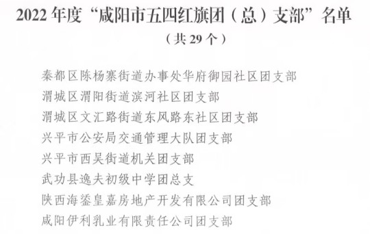 近日,共青团咸阳市委印发《共青团咸阳市委关于表彰2022年度“咸阳市优秀共青团员”“咸阳市优秀共青团干部”及“咸阳市五四红旗团(总)支部”“咸阳市五四红旗团委”的决定》(团咸发〔2023〕5号),公司团总支荣获“咸阳市五四红旗团(总)支部”称号。