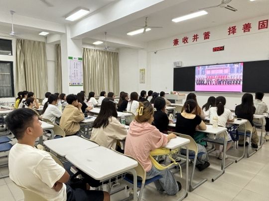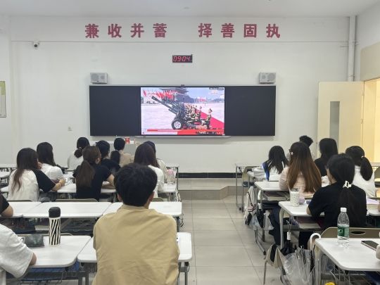 收看现场气氛庄重热烈,师生们全程专注,不时用手机记录下一个个震撼瞬间。当雄壮的国歌响起、五星红旗冉冉升起时,强烈的民族自豪感在每个人心中油然而生。阅兵式上,徒步方队步伐整齐、英姿飒爽,装备方队展示的新型武器装备先进精良,空中梯队气势磅礴、呼啸而过,这些都是我国国防力量强大的直观体现。在场师生不时爆发出热烈的掌声和欢呼声,为祖国日益强大的国防力量感到自豪。