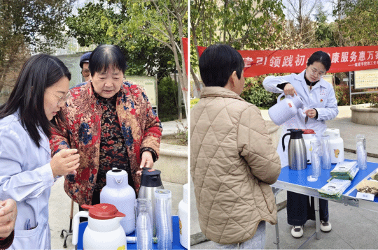 活动现场,教工党支部书记房媛老师聚焦老年居民用药需求,开展专项用药指导,详细讲解用药误区、药物搭配禁忌及服药剂量、时间等关键问题,帮助居民树立科学用药理念,同时结合 “健康中国” 理念普及合理用药与科学养生知识;吴用老师发挥专业特长,为居民开展健康咨询与义诊服务,针对高血压、糖尿病等常见慢性病提供科学的预防指导,助力居民做好慢病早防早控;郝春艳老师耐心细致,逐一解答居民关于饮食调理、运动保健、日常慢病管理等方面的疑问,用专业知识为居民的健康生活保驾护航;田倩倩老师向居民分发《春季养生手册》,并设置养生饮品品饮环节,让居民在亲身体验中感受春季养生的魅力,进一步提升居民的日常养生意识。