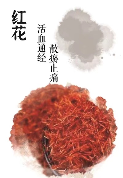红花味辛,性温,归心、肝经,具有活血通经,祛瘀止痛的功效。主治血滞经闭、痛经,胸痹心痛,血瘀腹痛,胁痛,跌打损伤等。红花是治跌打损伤、瘀滞肿痛之要药,常配木香、苏木、乳香等药用;或制为红花油、红花酊涂擦。