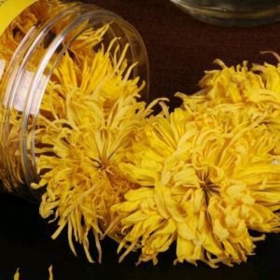 菊花,为菊科植物菊的干燥花序,9月至11月盛开时采收,可分为亳菊、滁菊、贡菊、杭菊等,以亳菊和滁菊品质最优。本品清香,其性甘、苦,微寒,善于疏风清热、平肝明目、解毒消肿,主治外感风热或风温初起、发热头痛、眩晕、目赤肿痛、疗疮肿毒。