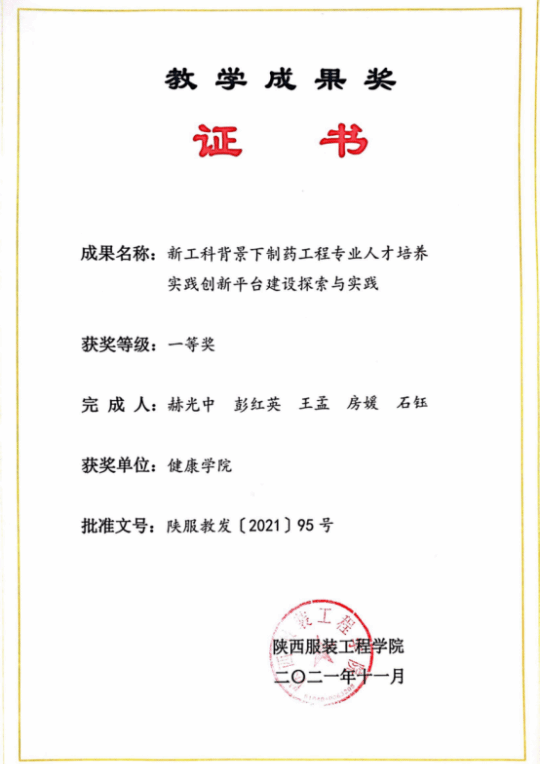 制药工程专业开设于2013年,2017年获得学士学位授予权2020年获校级一流专业,2023年获校级优势特色专业。该专业拥有省级教学改革项目1项,校级教学成果奖一等奖1项、二等奖1项,校级教学团队3个,一流课程4门,校级精品实验项目3个,课程思政示范课1门,校级MOOC建设项目1门,校级专创融合项目1项。