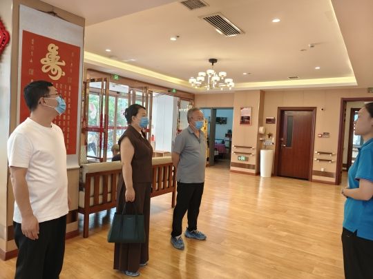 首先,在梧桐家苑颐养院吕经理的引导下,公司领导一行对颐养院西迁精神文化区域、护士办公区、院内康复室、综合活动室、餐厅和生活区等进行了全方位参观,对各项设施设备的功能以及医疗护理、健康管理、岗位要求等情况进行了详细了解。
